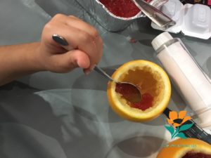 Mientras tanto, lavar las naranjas con agua caliente y secar. Cortarles una rodajita por debajo para que se aguanten de pie (haciendo de base). Por la parte superior, cortarles un círculo un poco más grande. Vaciarlas con una cucharilla, cortando la pulpa previamente con la ayuda de un cuchillo. Recortar los ojos y la boca con cuidado. Con la pulpa y el zumo sobrante, aprovechad para realizar un buen zumo de naranja. (Una de nuestras amigas se lo tomó en un santiamén).